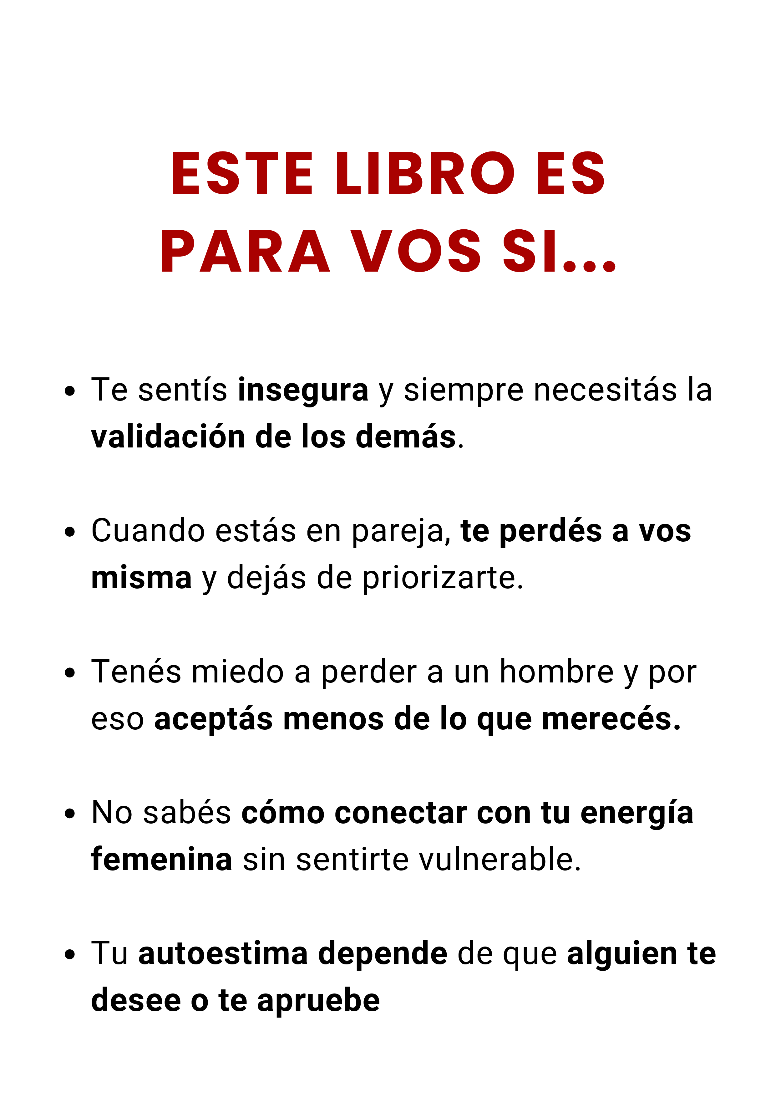 Este eBook fue creado para vos: una mujer que sabe que merece más, pero necesita las herramientas para reconectar con su poder interior, recuperar su autoestima, atraer relaciones sanas y vivir desde su máxima versión.