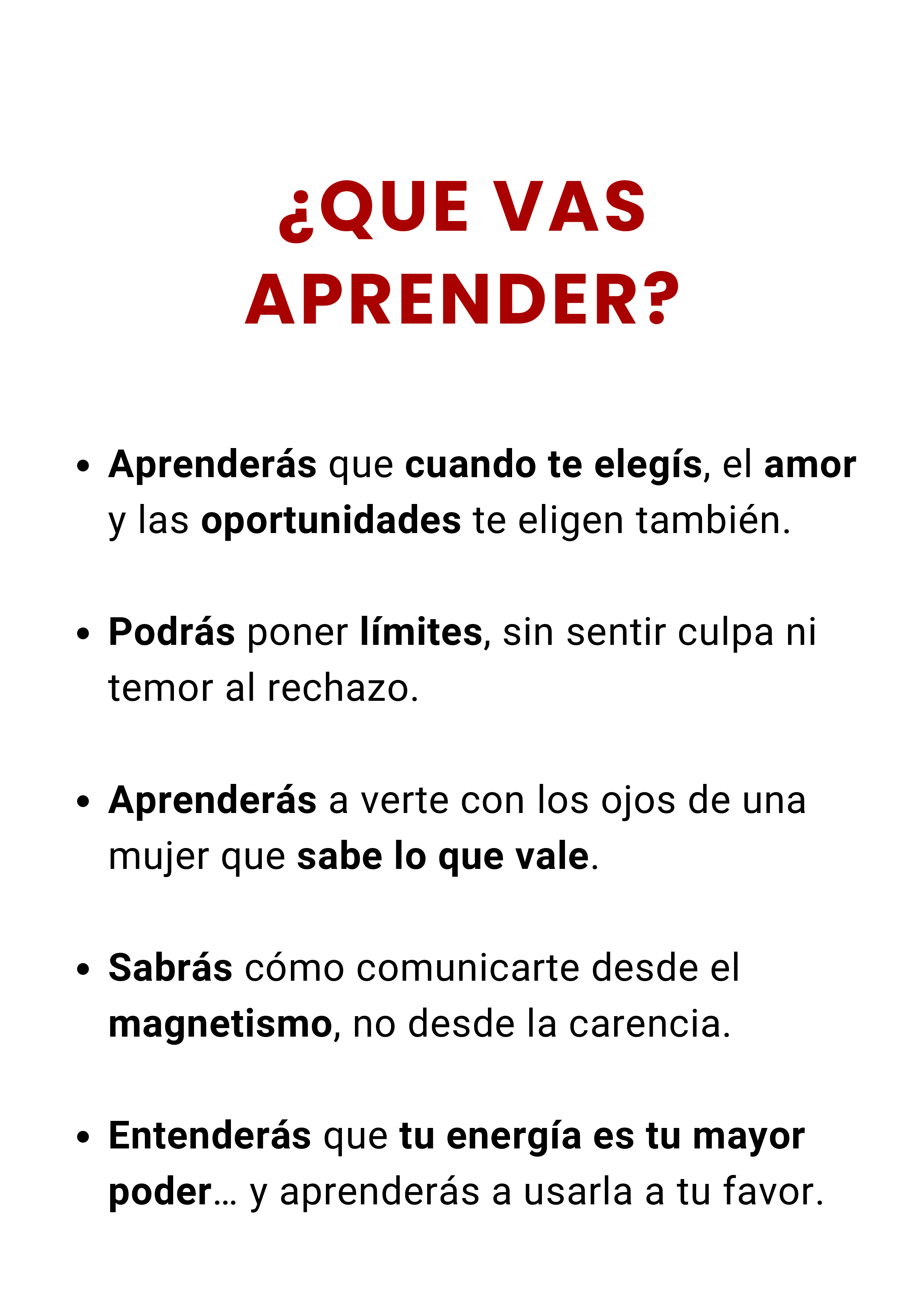 A mujeres de 21 a 55 años que desean empoderarse, recuperar su energía, dejar de mendigar amor y convertirse en su mejor versión.